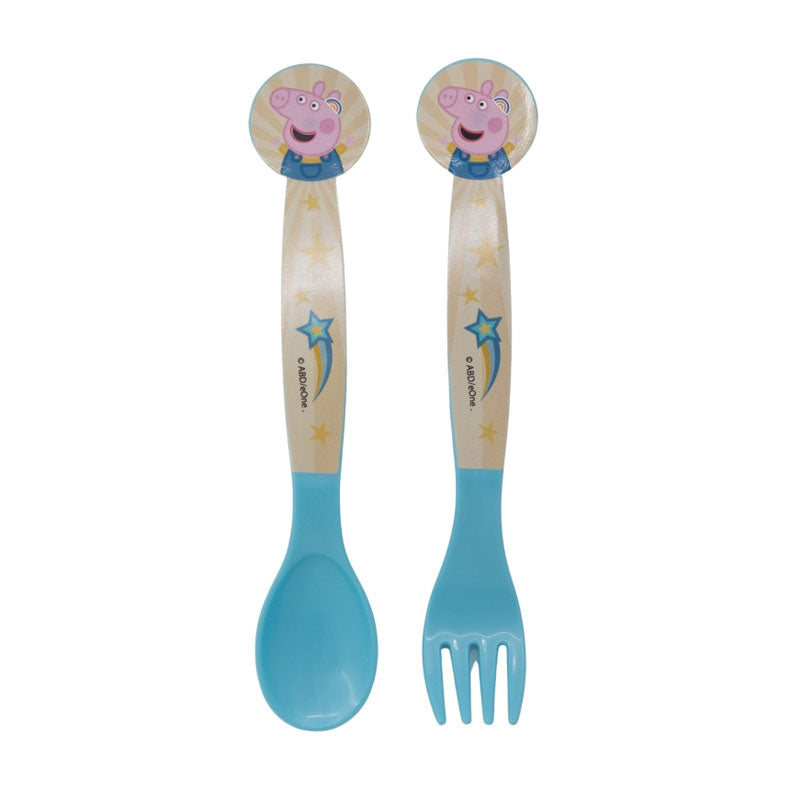 Conjunto composto por colher e garfo para que seu filho aprenda a usar talheres nas refeições de forma divertida e segura, graças ao material e ao formato arredondado.